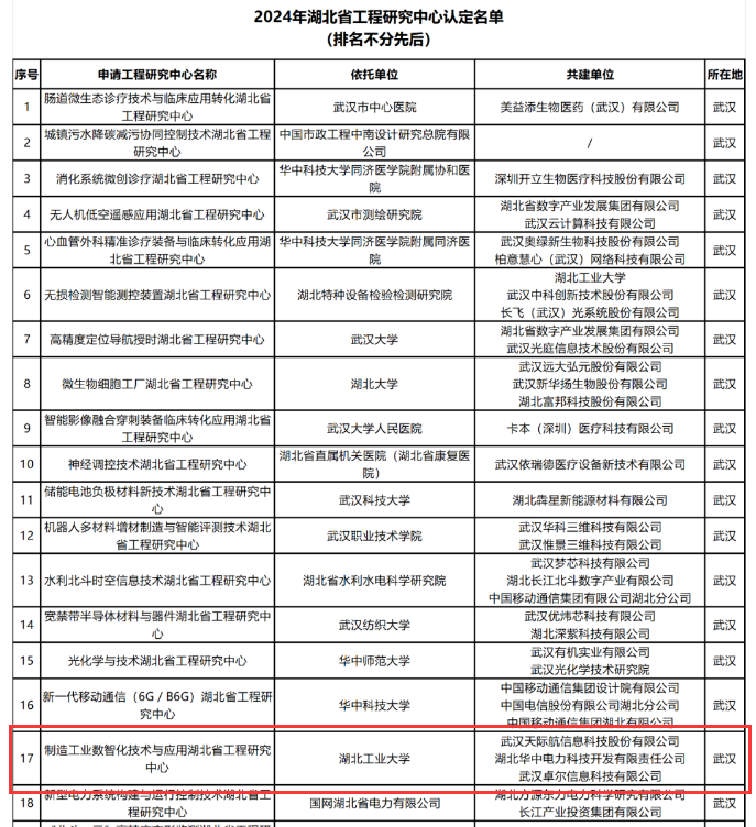 日前,湖北省科技厅公布了《省科技厅关于认定耳鼻咽喉及眼科疾病等17家湖北省重点实验室的通知》,学院“绿色智能算力网络湖北省重点实验室”获批认定;湖北省发展和改革委员会印发《关于公布2024年湖北省工程研究中心认定名单的通知》,学院“制造工业数智化技术与应用湖北省工程研究中心”获批认定。