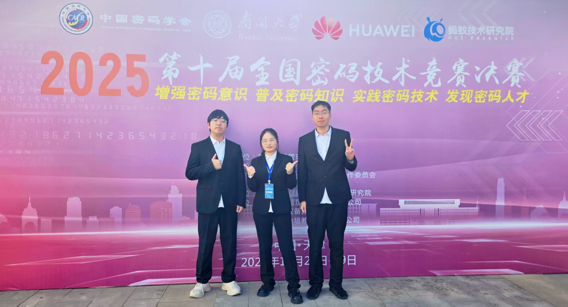 日前,由中国密码学会主办的2025第十届全国密码技术竞赛决赛在南开大学举办。经过激烈角逐,由张明武和王玉珠老师指导,团队高晶、刘逸霖和赵延瑞共同完成的作品“基于鲲鹏的SM2算法优化”,从晋级决赛的186支队伍中脱颖而出,斩获全国二等奖。