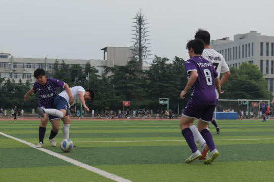 随着充满激情的音乐响起,两队分别入场。主裁判一声哨响,比赛正式开始,鼓声阵阵,两队进行了激烈的拼抢。上半场比赛中,计算机学院足球队处于慢热状态,对方多次将球带到我方球门附近,造成了极大威胁,但球员们一次次化解了危机。临近上半场结束时,我方在禁区犯规,对方点球得分,比分1:0。此时,也激发了我院球员与观众的体育精神与顽强斗志。中场休息,球员与学工办所有老师一起商讨对策,互相鼓励,球员们也积极调整。