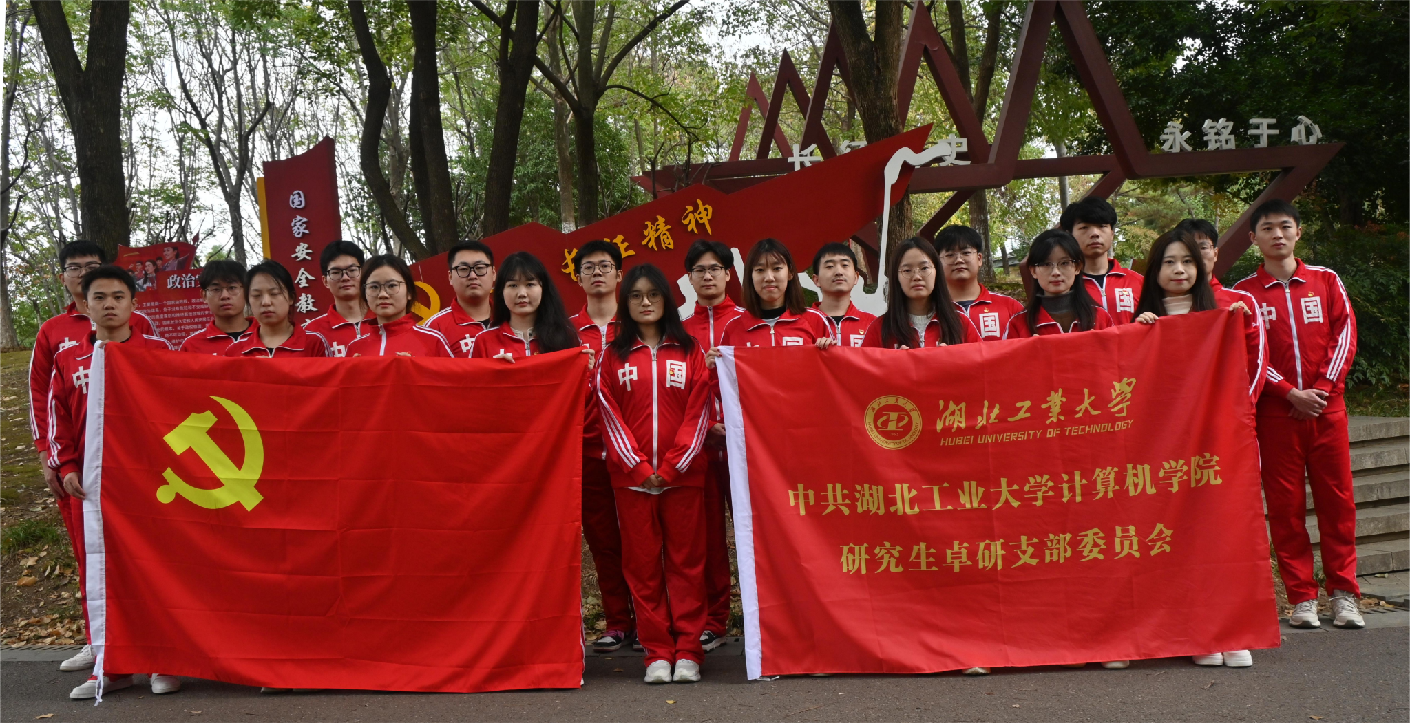 2024年11月20日下午,湖北工业大学计算机学院研究生卓研党支部的党员齐聚武汉市汉阳区墨水湖公园重走长征路红色研学基地,开启了一场别开生面的红色研学之旅。本次党日活动旨在通过重走长征路,深入了解长征精神的历史背景和深刻内涵,让党员们亲身感受红军长征的艰辛与伟大。同时,创新性地开展红色教育和党性教育,增强党员的责任感和使命感,为党的事业贡献自己的力量。