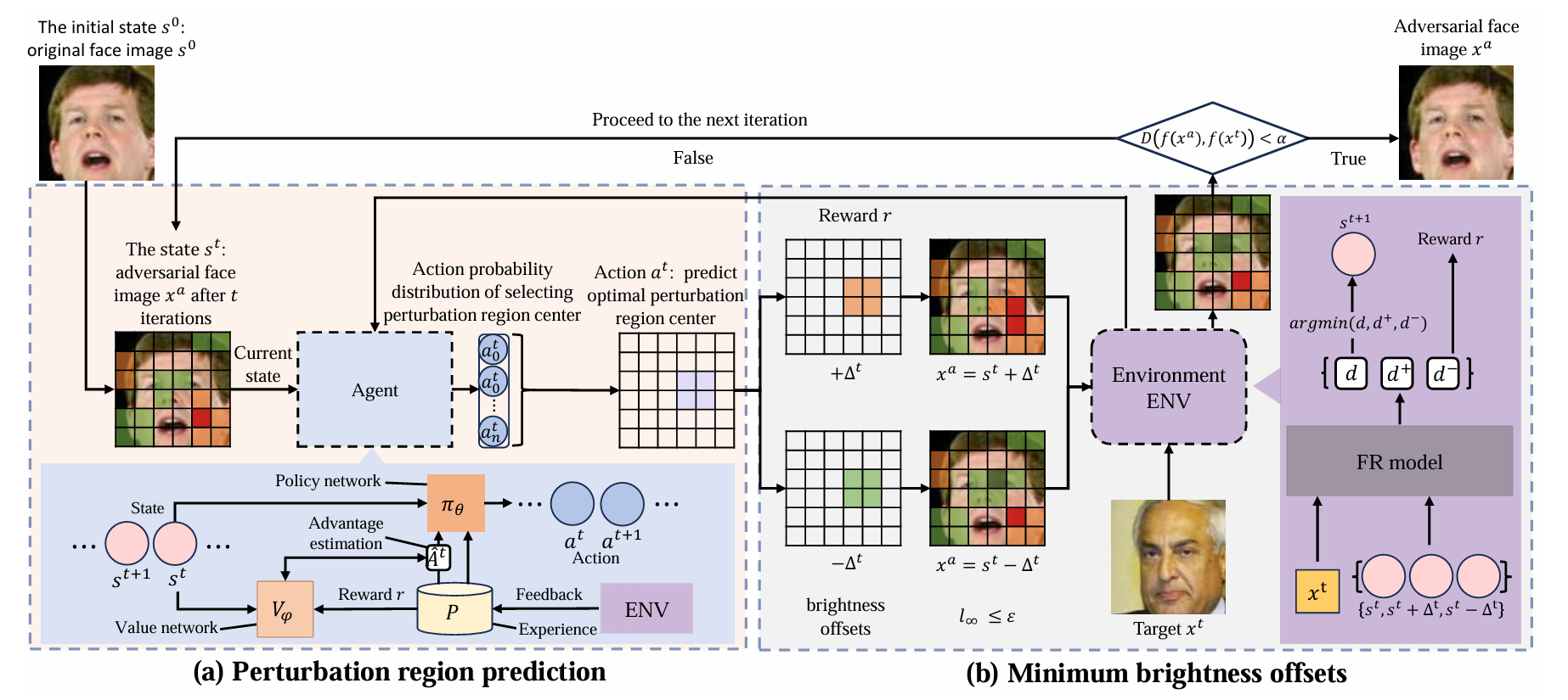 为实现这一目标,文章设计了一种基于近端策略优化的智能体,用于预测人脸图像中的扰动区域,并自适应地对这些区域施加扰动。为进一步保障对抗人脸图像的高质量,我们还提出了一种最小亮度偏移方法,专门用于生成能最小化对抗样本与目标人脸在特征嵌入空间中差异的扰动。实验结果表明,在七种主流人脸识别模型上,该方法在攻击成功率方面平均优于当前最先进的FR攻击方法21.7%,同时生成的对抗图像具有更优的视觉质量。