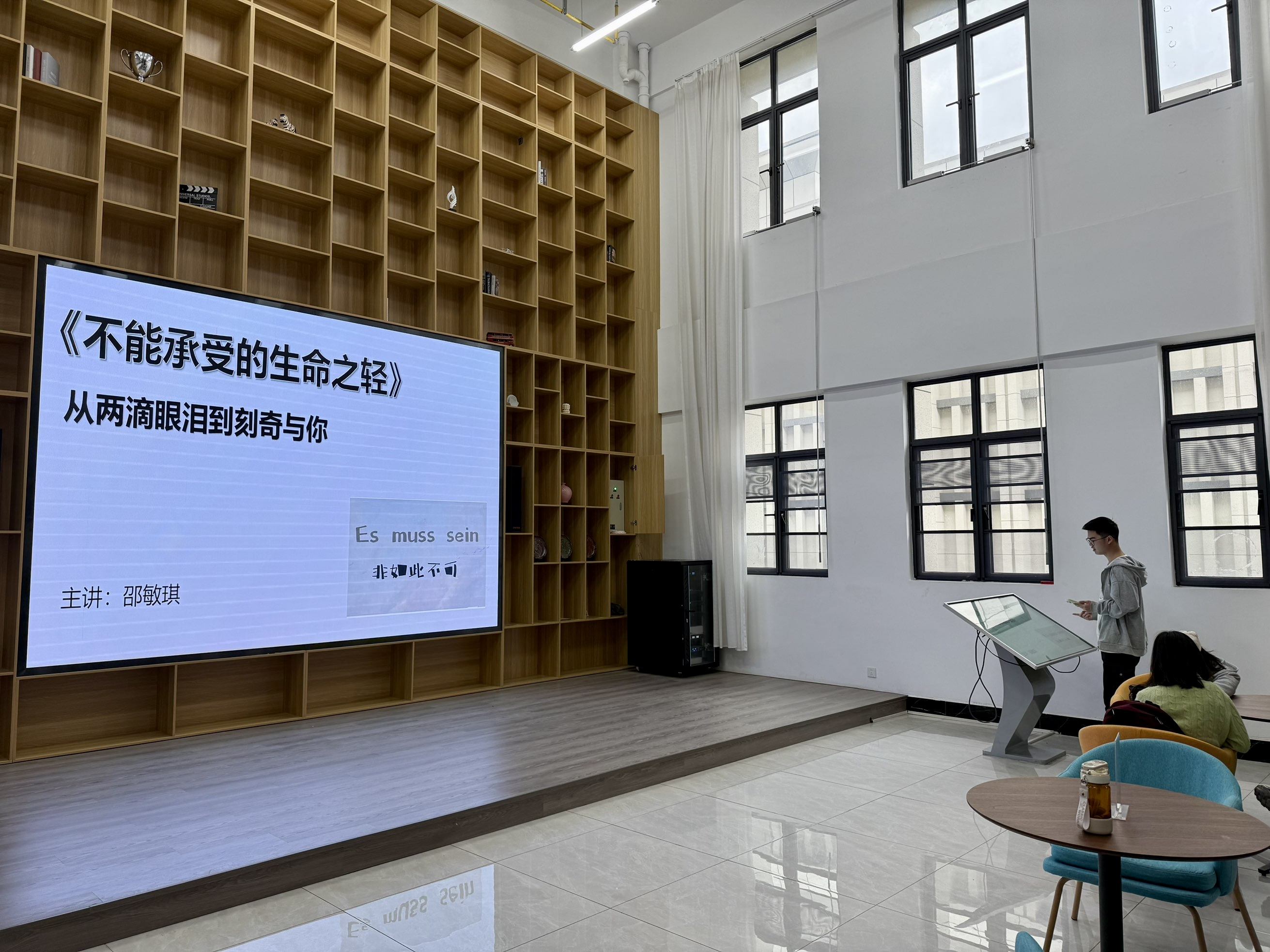 随后,4位主讲人依次登台,结合精心制作的PPT,分别带来四部经典文学作品的深度分享。25计科1班的何奕欣分享居斯塔夫・福楼拜的《包法利夫人》,从现实与理想的冲突中剖析人性弱点与社会映照;25计科2班的林雨彤分享艾米莉・勃朗特的《呼啸山庄》,展现极致爱与恨中的人性复杂与宿命感;25计科1班的邵敏琪分享米兰・昆德拉的《不能承受的生命之轻》,探讨“轻与重”“灵与肉”“偶然与必然”等哲学命题下的生命价值;25计科2班的董婉婷分享沈从文的《边城》,讲述湘西纯净人情与自然之美,传递朴素宁静的生命美学。分享过程中,同学们认真聆听、沉浸思考,在不同书籍的多元视角中收获新知。
