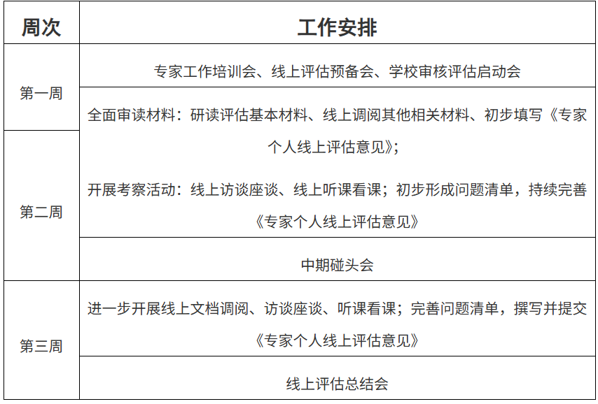线上评估时间一般为2-4周。专家组组长召开专家组线上工作培训会、线上评估预备会,明确评估要求及时间安排,分配工作任务后开始线上评估工作。