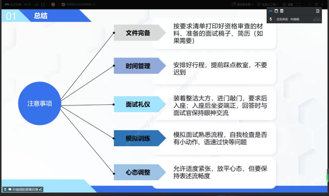 3月18日,高飞、胡嘉秋以“考研复试准备策略与实战技巧”为主题,结合自身成功上岸的经历展开分享。高飞详细讲解了复试流程、专业课复习重点以及英语口语训练方法,并强调了提前联系导师和模拟面试的重要性。胡嘉秋则聚焦跨专业考研的复试策略,分享了如何通过科研经历、项目成果和竞赛奖项突出个人优势。她还现场演示了自我介绍与高频问题的应答技巧,为同学们提供了实用的面试模板。